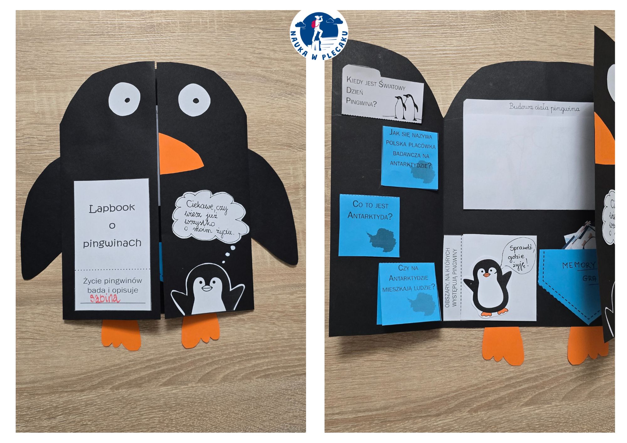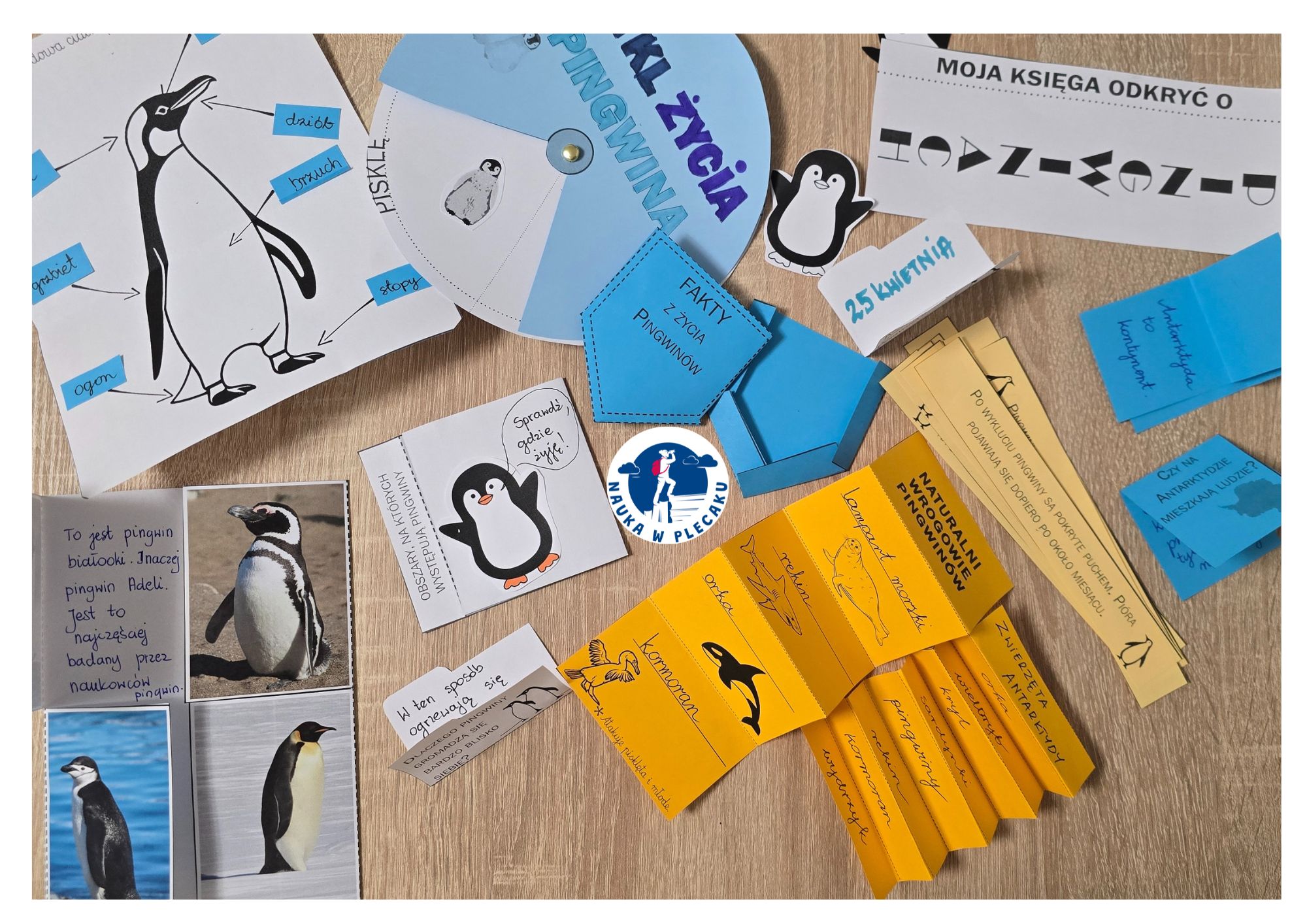Na części elementów umieszczono jedynie pytania lub zagadnienia, na które dzieci samodzielnie odpowiadają podczas zdobywania wiedzy o pingwinach np. Książeczka – Co warto wiedzieć o pingwinach, czy też fiszki.
